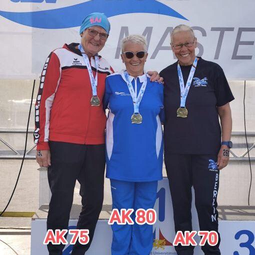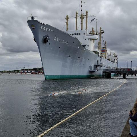 Am ersten Wettkampftag der Freiwasser Masters in Rostock wurde erstmals die neu eingeführte 1,25-km-Strecke geschwommen. Die Runde führte einmal um das markante Museumsschiff – eine attraktive, aber auch anspruchsvolle Strecke, die den Schwimmerinnen und Schwimmern einiges abverlangte.