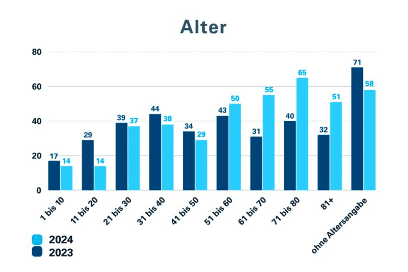 Das Angebot der Schwimmabzeichentage richtet sich nicht nur an Kinder und Jugendliche, sondern ausdrücklich auch an Erwachsene. Denn während sich unter Kindern, Jugendlichen und Erwachsenen bis Anfang 50 im Jahr 2024 weniger Todesfälle ereigneten, häuften sich diese darüber hinaus deutlich. Rund 60 Prozent der Opfer bekannten Alters waren laut DLRG-Report älter als 55 Jahre. Bei den Kindern bis zehn Jahren kam es zu 14 tödlichen Unglücken. Mindestens acht Jungen und Mädchen waren im Alter bis fünf Jahre (2023: zehn); sechs Kinder waren zwischen sechs und zehn Jahre (2023: sieben) alt.