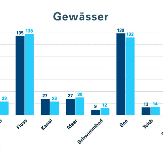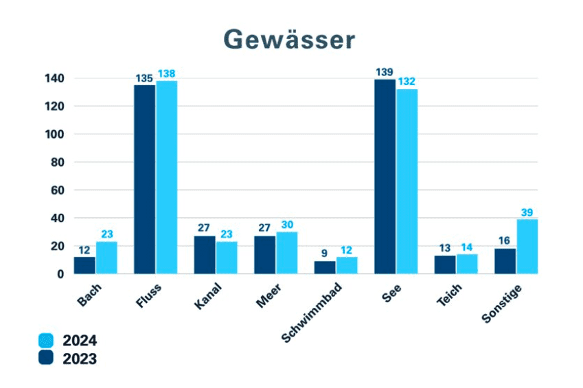 Im Jahr 2024 hat es mindestens 411 tödliche Unglücke in den deutschen Gewässern gegeben. Das sind laut Statistik der Deutschen Lebens-Rettungs-Gesellschaft (DLRG) 31 Ertrunkene mehr als im Jahr zuvor und bedeutet zum dritten Mal in Folge einen Anstieg der Todesfälle. Knapp die Hälfte (48 Prozent) der tödlichen Unfälle ereignete sich in den drei Sommermonaten ab Juni. Besonders viele Menschen ertranken im heißen Monat August: 80 Opfer bedeuten eine Zunahme von 33 Personen gegenüber dem Vorjahresmonat. Mehr Todesfälle in einem Monat (117) zählte die DLRG zuletzt im August 2020.