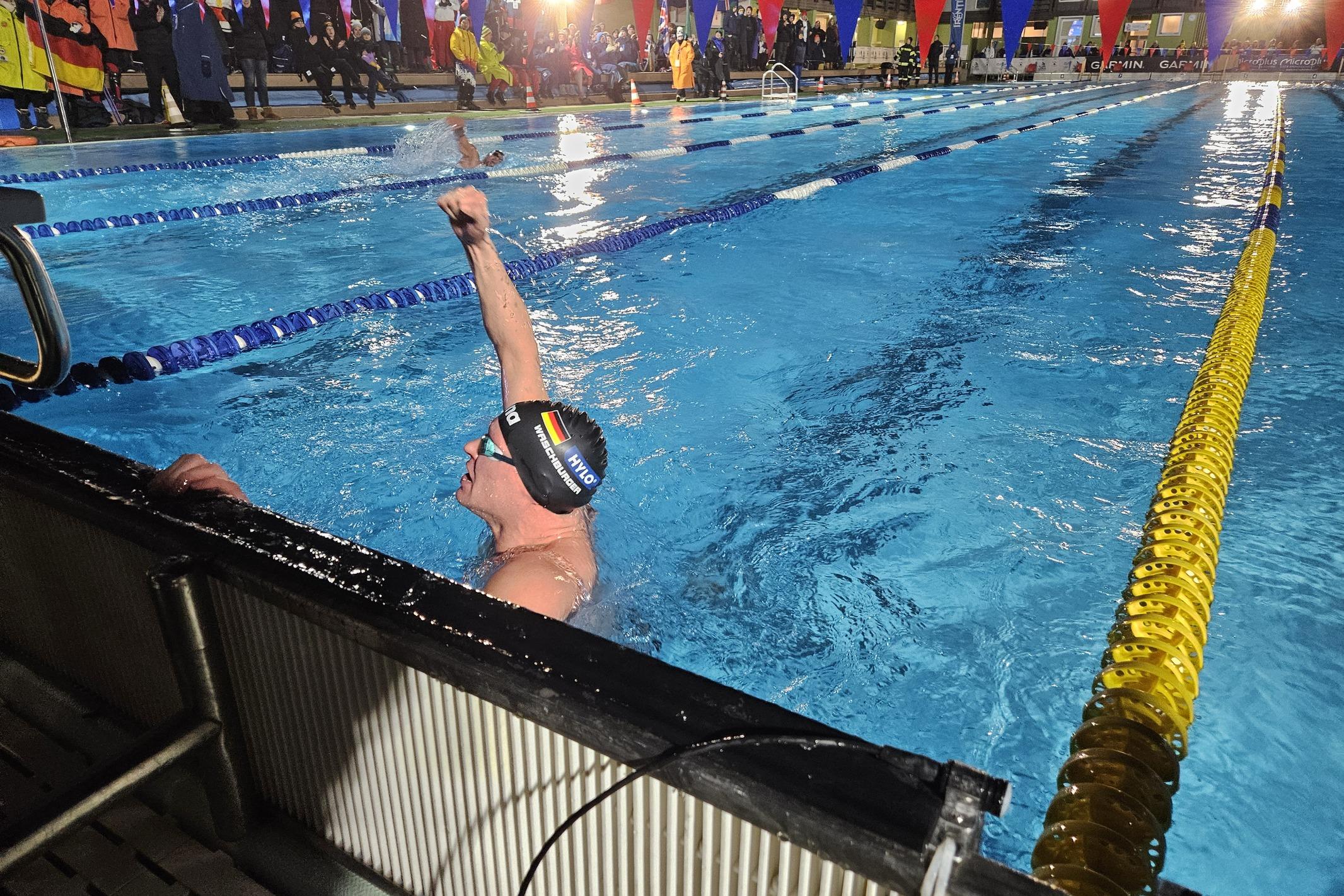 Die Titel über die langen Strecken zu verteidigen, bleibt aber sein großes Ziel. Dabei steht ihm Axel Reymond im Weg. Der Franzose ist zweifacher Weltmeister über die 25 Kilometer im Freiwasser und hat auch schon sieben EM-Medaillen in seiner Sammlung. Bei der Eisschwimm-WM 2025 gab er sich über den Kilometer nur Waschburger geschlagen. „Axel hat einen Trainerwechsel hinter sich und ist fitter als die letzten Jahre“, schätzt Waschburger seinen französischen Haupt-Konkurrenten am Freitag ein. Die 500 Meter am Dienstagnachmittag Freistil werden wohl eine Wundertüte. Der Pole Maksymillian Bem ist als Eischwimm-Neuling nur knapp drei Sekunden über Waschburgers Weltrekord gemeldet. Und auch ein Russe, der unter neutraler Flagge wieder starten darf, ist nach vier Jahren Abwesenheit schwer einzuschätzen.