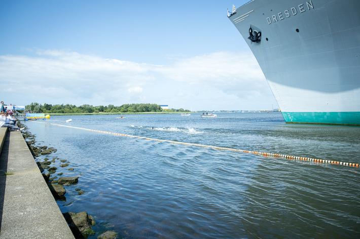 Spannende Entscheidungen, kühle Temperaturen und ein riesiges Schiff als Kulisse bei der DM im Freiwasserschwimmen in Rostock.