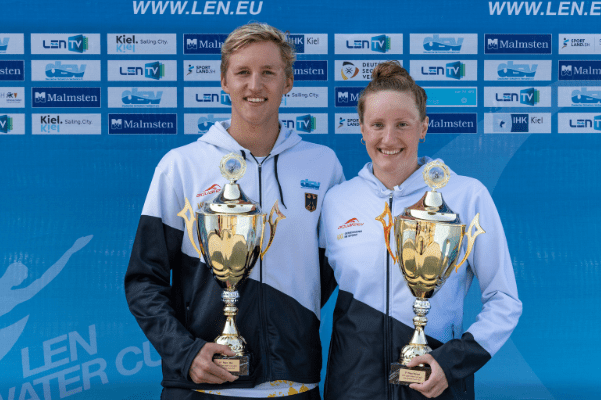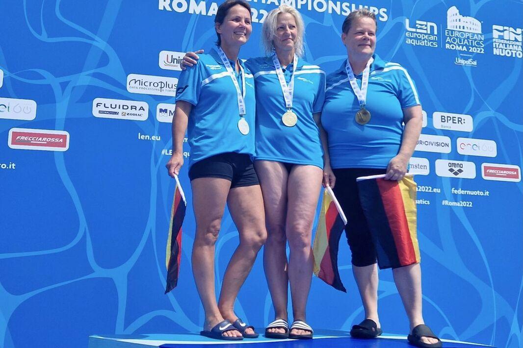 Auch der Tag 2 der Masters-EM in Rom glänzt mit drei Europameister*innen und zwei weiteren Bronzemedaillengewinnern für das deutsche Team. Die dreifache deutsche Freiwassermeisterin in der AK 25 Alisa Fatum wurde ihrer Favoritenrolle gerecht und gewann mit einer Minute Vorsprung in 38:08,6 bei besten Bedingungen im Mittelmeer vor Ostia. Bettina Merkle tat es ihr gleich und siegte in 38:52,1 in der AK 30. Bei den Herren gewann Eduard Mannanov (AK 35) in einem furiosen Rennen überlegen in 34:33,2 den Europameistertitel. Der aktuelle deutsche Meister über 2,5km Bastian Schorr (AK 35) schwamm auf den dritten Platz in 36:35,1 und den Medaillenspiegel komplettierte der deutsche Vizemeister über die 2,5km Christian Hemker (AK 25) mit Platz 3 in 36:43,1. Ulrike Urbaniak, Vorsitzende der Wettkampfabteilung Masterssport im DSV und in ihrer Funktion als Vertreterin der deutschen Masters bei der LEN gratulierte vor Ort und freute sich mit allen gestarteten deutschen Masters über den gelungenen Auftakt in die EM. Am dritten Wettkampftag im Freiwasserschwimmen starten die Altersklassen 50+ unter anderem mit dem deutschen Meister Karsten Dellbrügge und dem Vizemeister Alexander Middendorf in der AK60 sowie der deutschen Meisterin Regina Dobschin in der AK 60.