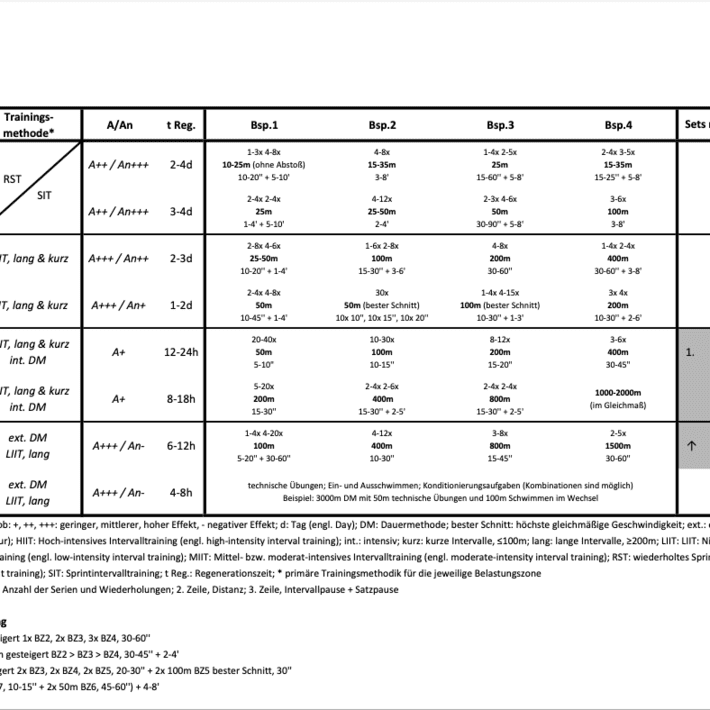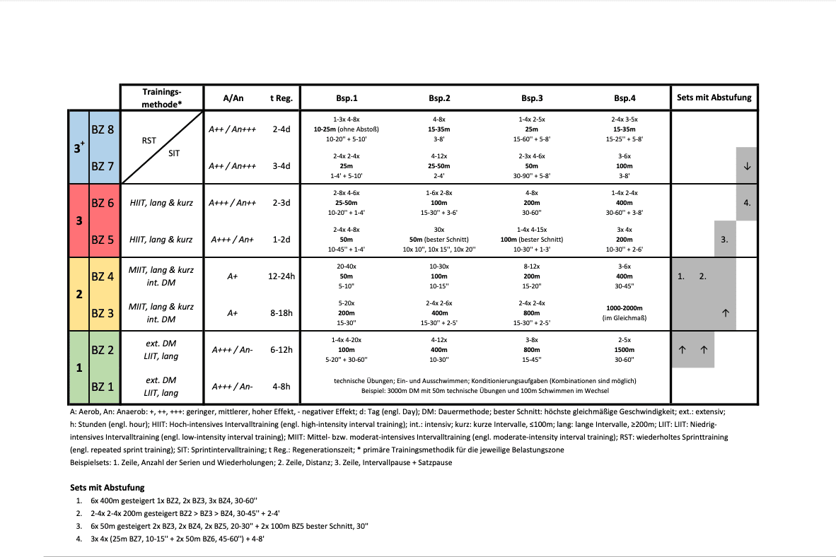 Sets mit Abstufung: Trainingssets können nicht nur einheitlich innerhalb einer Belastungszone gestaltet werden, sondern auch über mehrere Belastungszonen – abgestuft. Entsprechende Beispiele sind im rechten Abschnitt der Tabelle gegeben.. Eine Beispielerklärung dafür steht unter der Tabelle selbst.