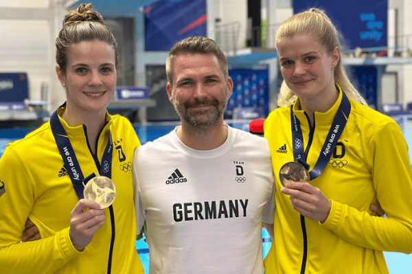 Die deutsche Nationalhymne avancierte am Dienstag bei den Europameisterschaften der Wasserspringer*innen in Rzeszów zur Hit-Single. Denn die Wettbewerbe vom Turm waren am vorletzten Tag dieser EM im Rahmen der European Games in Polen fest in der Hand der Aktiven des Deutschen Schwimm-Verbandes e.V. (DSV). Zunächst gewannen die Schwestern Christina Wassen und Elena Wassen (beide Berliner TSC) das Turm-Synchronspringen, am Abend triumphierte dann auch noch Timo Barthel (SV Halle) im Turm-Einzel. Damit ist dem DSV zugleich ein weiterer Olympia-Startplatz sicher, der bei diesen Titelkämpfen jeweils an die Länder der Gewinner*innen vom 3m-Brett und vom Turm vergeben wird. Zuvor hatte auch schon Moritz Wesemann (SV Halle) vom 3m-Brett einen solchen Quotenplatz geholt. „Was für ein Tag“, jubelte Bundestrainer Christoph Bohm. „Ich bin sehr stolz auf das gesamte Team. Nicht nur auf die Aktiven, sondern auch auf die Trainer und den ganzen Betreuungsstab. Diese Erfolge sind immer auch eine Teamleistung.“ Timo Barthel siegte am Abend mit 435,40 Punkten vor Robbie Lee (GBR/413,20) und Riccardo Giovannini(ITA/411,20). Es war der erste deutsche Europameistertitel vom Turm seit dem Erfolg von Martin Wolfram 2015 in Rostock. Schon im Vorkampf war Barthel der Stärkste gewesen, im Finale lag er dann zunächst in Lauerstellung. Vor dem letzten Versuch hatte er noch rund 22 Punkte Rückstand auf den führenden Briten Benjamin Cutmore. Dieser verpatzte jedoch seinen letzten Sprung und ging als Vierter (410,75) letztlich leer aus, während Barthel zum Abschluss einen fast perfekten 3,5-fachen Auerbachsalto ins Wasser setzte. „Er hat uns zwischendurch ein-, zweimal zittern lasen und ein paar kleine Fehler eingebaut, aber hinten raus war das sowas von stark. Das war der Sprung, den er in Tokio verballert hat und weswegen er damals das Olympiafinale verpasst hat. Diesmal hat er wieder so viel Druck gehabt und das Ding einfach gebracht“, sagte Bohm.