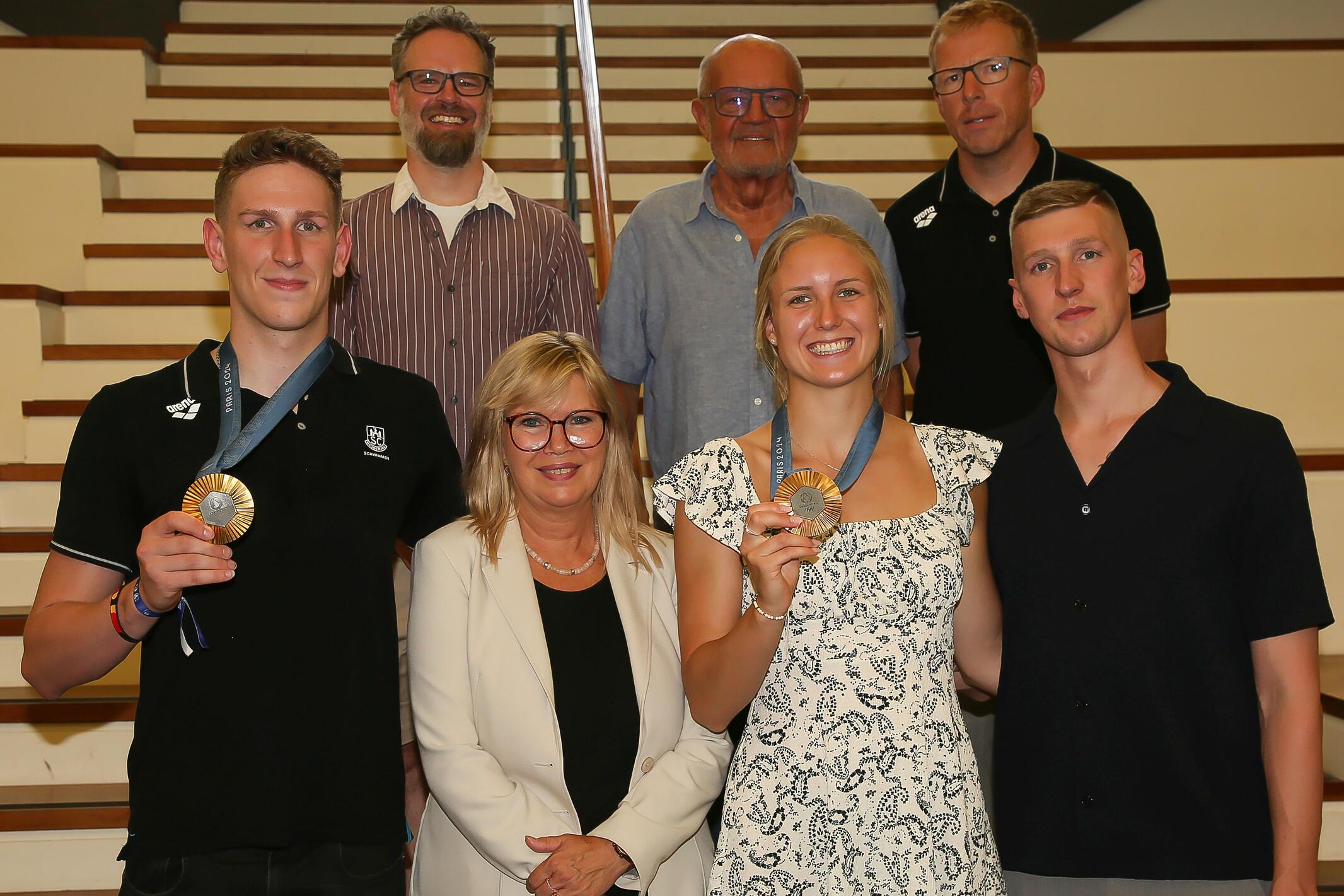 Magdeburgs Oberbürgermeisterin Simone Borris ehrte die Olympiahelden Isabel Gose, Lukas Märtens und Florian Wellbrock (vordere Reihe), und natürlich auch die Trainer Bernd Berkhahn, Norbert Warnatzsch und Physiotherapeut Eicke Schiller (hinten von rechts) ©pa/dpa