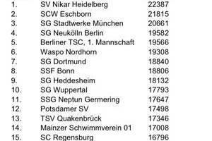 sogar noch 2 Sekunden schneller und sicherte seinem Team endgültig den Sieg. Ähnlich dramatisch das Nachschwimmen von Monika Senftleben (AK 80) über 200m Brust in 04:45,83. Ihre Punktzahl von 1100 katapultierte die Vorjahressieger der SG Neukölln Berlin auf Platz 4.