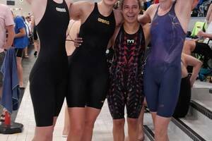 Regen, Regen stört uns nicht....Während wir in der kuschelig warmen Schwimmhalle sitzen, rinnt der vorhergesagte Regen stetig über die Fensterscheiben des beeindruckenden neuen Sportbades, das sich für weitere Großveranstaltungen geradezu anbietet. Wieder geht es mit Staffeln los, dieses Mal mit den 4 x 100 m Lagenstaffeln der Damen und Herren.