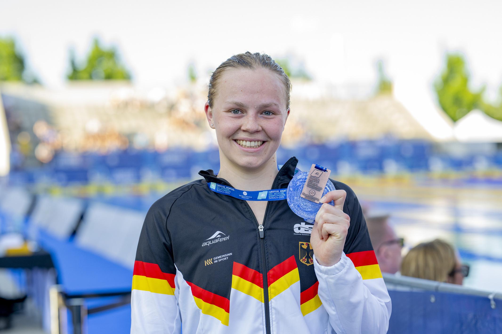 Begonnen hatte der letzte Wettkampfabschnitt mit Bronze für Marian Plöger. Über 1500m Freistil waren nur Artemis Vasiliaki (GRE/16:22,20 Minuten) und Klaudia Tarasiewicz (POL/16:26,58) schneller als die 19-Jährige vom SV Cannstatt (16:32,40).