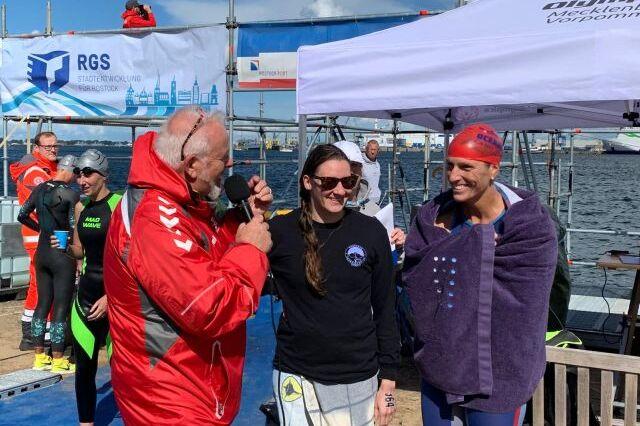 Zwei weitere Einzelstarts stehen in der Warnow am Wochenende dann auch noch an. Einfach, um die Anreise besser zu rechtfertigen und um den guten Trainingszustand zu nutzen. Cathleen Rund erzählt im Interview, wie sehr sie bis heute das Schwimmen liebt. Es helfe ihr im Alltag, nach beruflichen Belastungen als LKA-Beamtin Stress abzubauen und motiviert sie auch zu Vorbereitungen ihrer schwimmerischen Aktivitäten im Urlaub. Dort durchschwamm sie beispielsweise auch schon mal die 14 Kilometer lange Strecke zwischen Fuerteventura und Lanzarote („Traversia La Bocaina“). Auch die ähnlich lange Straße von Gibraltar zwischen Europa und Afrika möchte sie demnächst gern noch durchschwimmen.