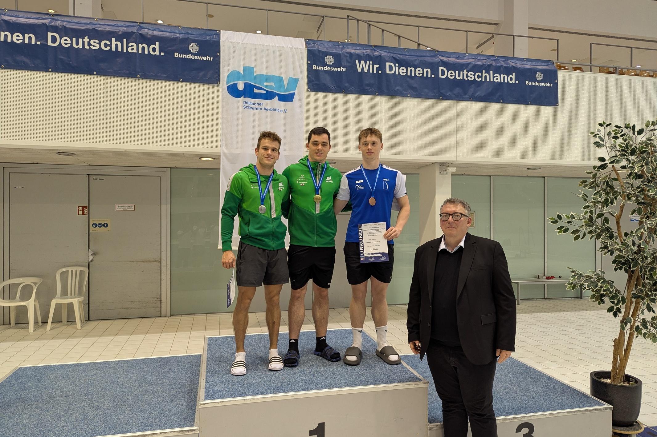 „Dreimal über 400 Punkte und sogar persönliche Punktbestleistung im Einzel, damit kann man zu diesem Zeitpunkt nur zufrieden sein“, meinte Massenberg nach der Siegerehrung durch DSV-Präsident David Profit. Der Neuanfang mit dem Wechsel nach Halle mache sich bereits bezahlt, das Selbstbewusstsein steige dadurch auch. „Das Training bei Norman Becker hat mich und auch meinen Partner Jonathan stark vorangebracht. Ich spüre inzwischen viel mehr Sicherheit, das merke ich auch im Training“, meinte Massenberg. „Sicher muss ich noch an den Endphasen arbeiten, um auch international bestehen zu können. Nach dieser DM-Leistung kann mein Ziel nun aber nur lauten, sich beim Weltcup auch fürs Super Final zu qualifizieren.“ Der Weltcup-Abschluss findet dann in Peking (CHN/01. – 03. Mai) statt.