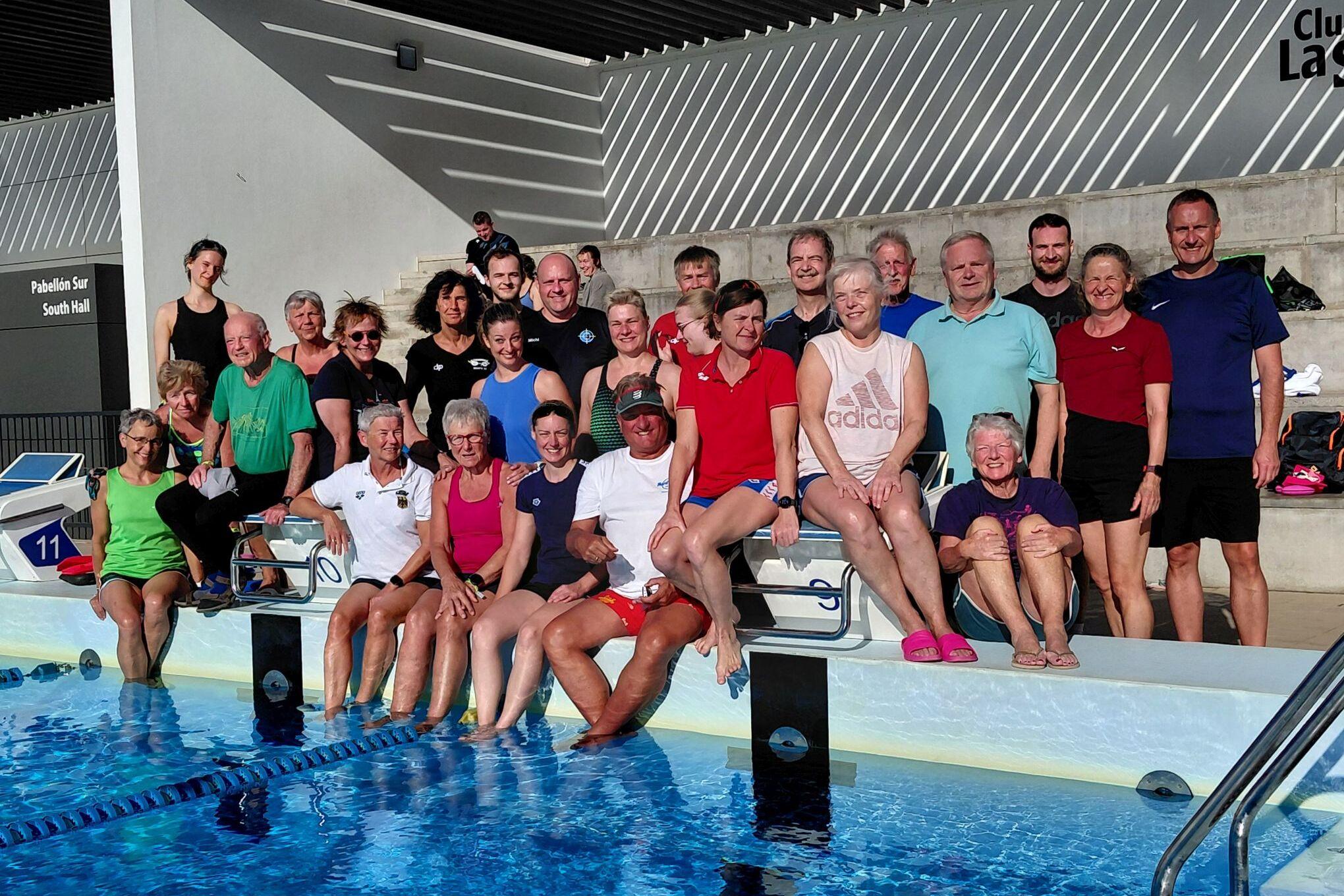 Zu den Deutschen Kurzbahnmeisterschaften der Masters braungebrannt auf dem Startblock zu stehen, das haben wir uns (nachdem wir einige erfolgreiche Masters in den letzten Jahren zu den DM beobachtet haben) schon immer gewünscht. Letztes Jahr hat es nicht so geklappt (ich war durchgehend kränklich) aber dieses Jahr soll es nun so sein. Die entsprechende Leistung darf dann auch auf der Anzeigetafel stehen- das hoffe ich! Auf alle Fälle hat uns das Trainer-Team mit Margarete Esser und Petra Nickel sehr gut vorbereitet: Zweimal täglich Wassertraining mit gleichermaßen umfangreichen wie auch abwechslungsreichen und anspruchsvollen Aufgaben – dazu eine Trockeneinheit in der Dehnung und Faszientraining im Vordergrund standen sollen dem Ziel dienen. Margarete Esser ist nicht nur die Dienstälteste Lanzarote-Schwimmtrainingslager-Fliegerin ( 39 mal dabei !), sondern hat sich auch immer als “Guter Geist” bewährt . In Paarung mit Petra Nickel, der Technik- Königin ( 7 mal dabei) haben beide die 22 Teilnehmer dort abgeholt, wo sie gestanden haben und dahin gebracht, wo sie hin wollten. Alle Master-Schwimmer, die meisten sind Repeater (18) sind hoch zufrieden und gebräunt nach Hause geflogen. Wir hoffen inständig, dass das dieses Trainingslager auch in den nächsten Jahren fortgeführt werden kann.