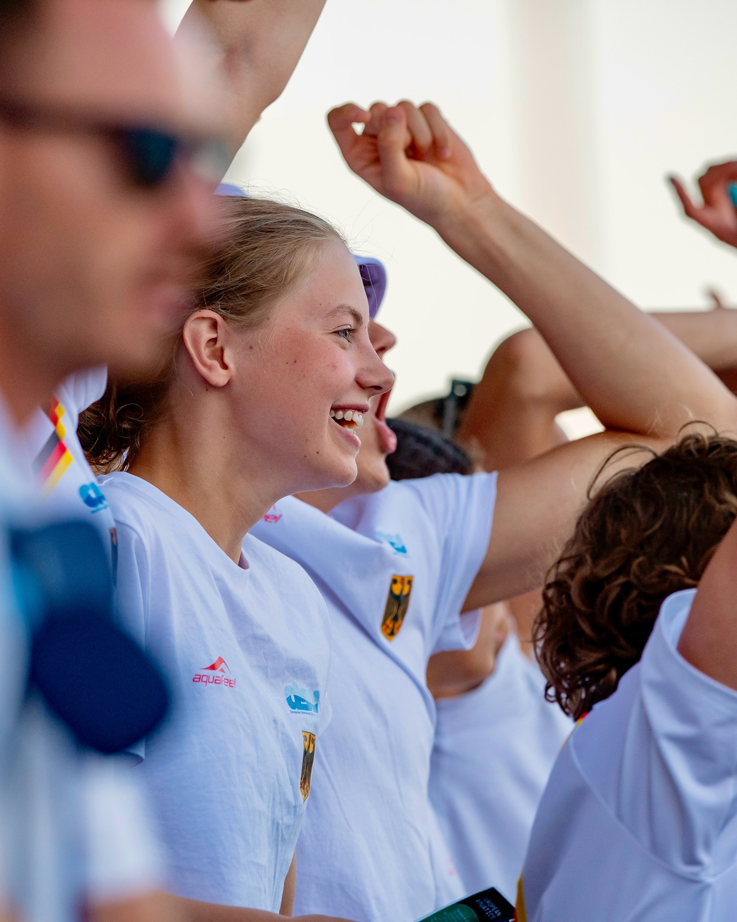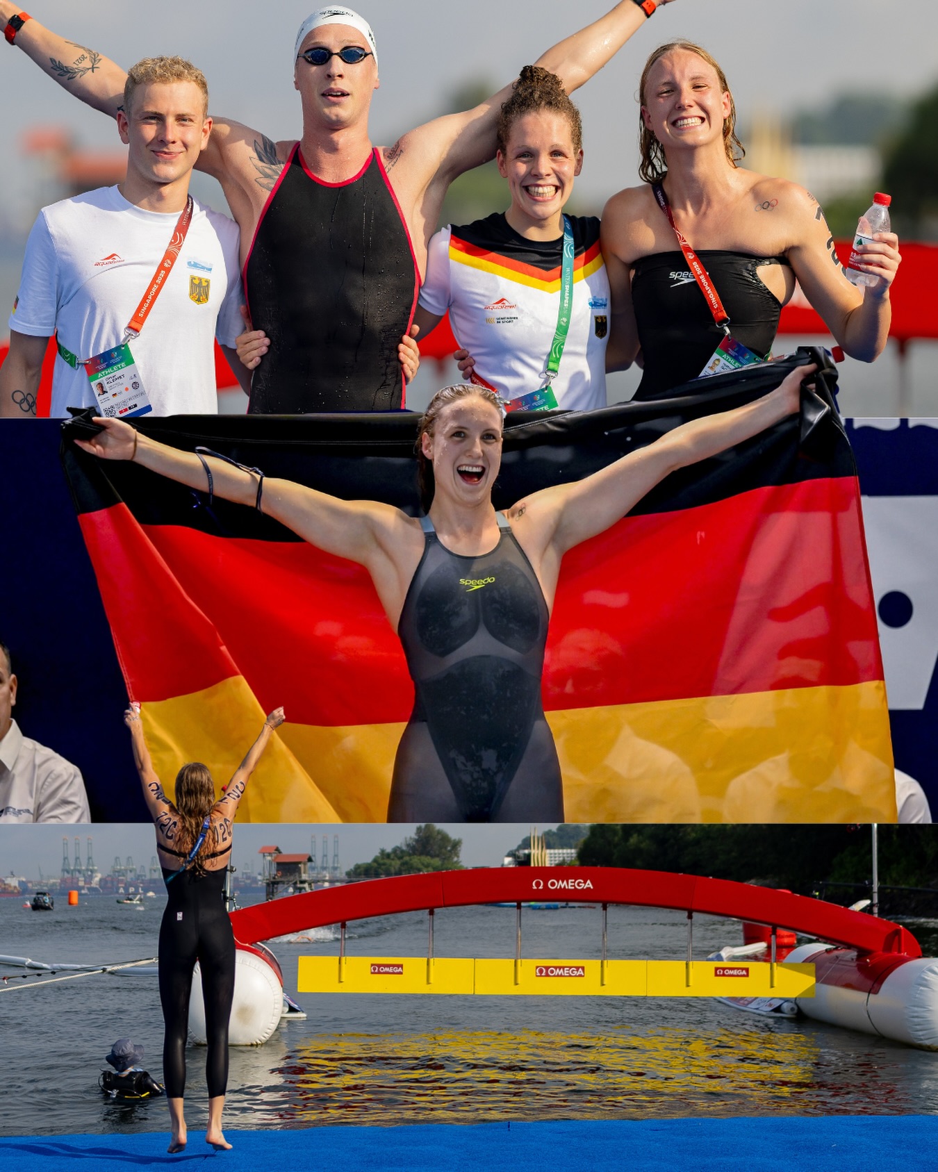 Bei der WM in Singapur schwimmt Isabel mit @flo.swim @olli.kle & @celine_rieder zu Gold in der Freiwasser-Staffel 🥇