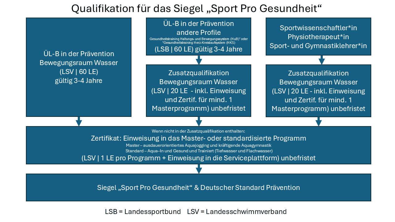 Das Qualitätssiegel SPORT PRO GESUNDHEIT / Gesund & fit im Wasser ist eine Auszeichnung für besondere Gesundheitssport-Angebote im Verein, die festgelegte Qualitätskriterien erfüllen. Das Qualitätssiegel hilft Schwimmvereinen, nach außen deutlich zu machen, dass sie über qualitativ hochwertige Angebote im Gesundheitssport verfügen. Die Anerkennung durch die Zentrale Prüfstelle Prävention ermöglicht es den Teilnehmern, diese Kurse über die Krankenkassen abzurechnen. Für die Schwimmvereine sind derzeit 5 Programme für die SERVICEPLATTFORM SPORT PRO GESUNDHEIT zertifiziert.